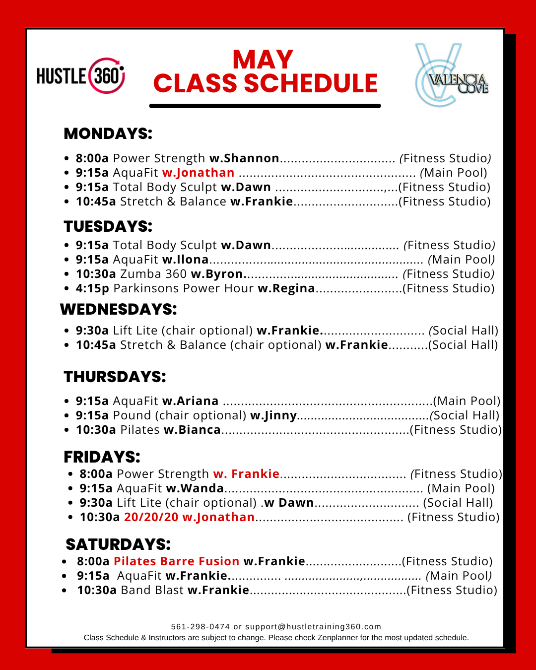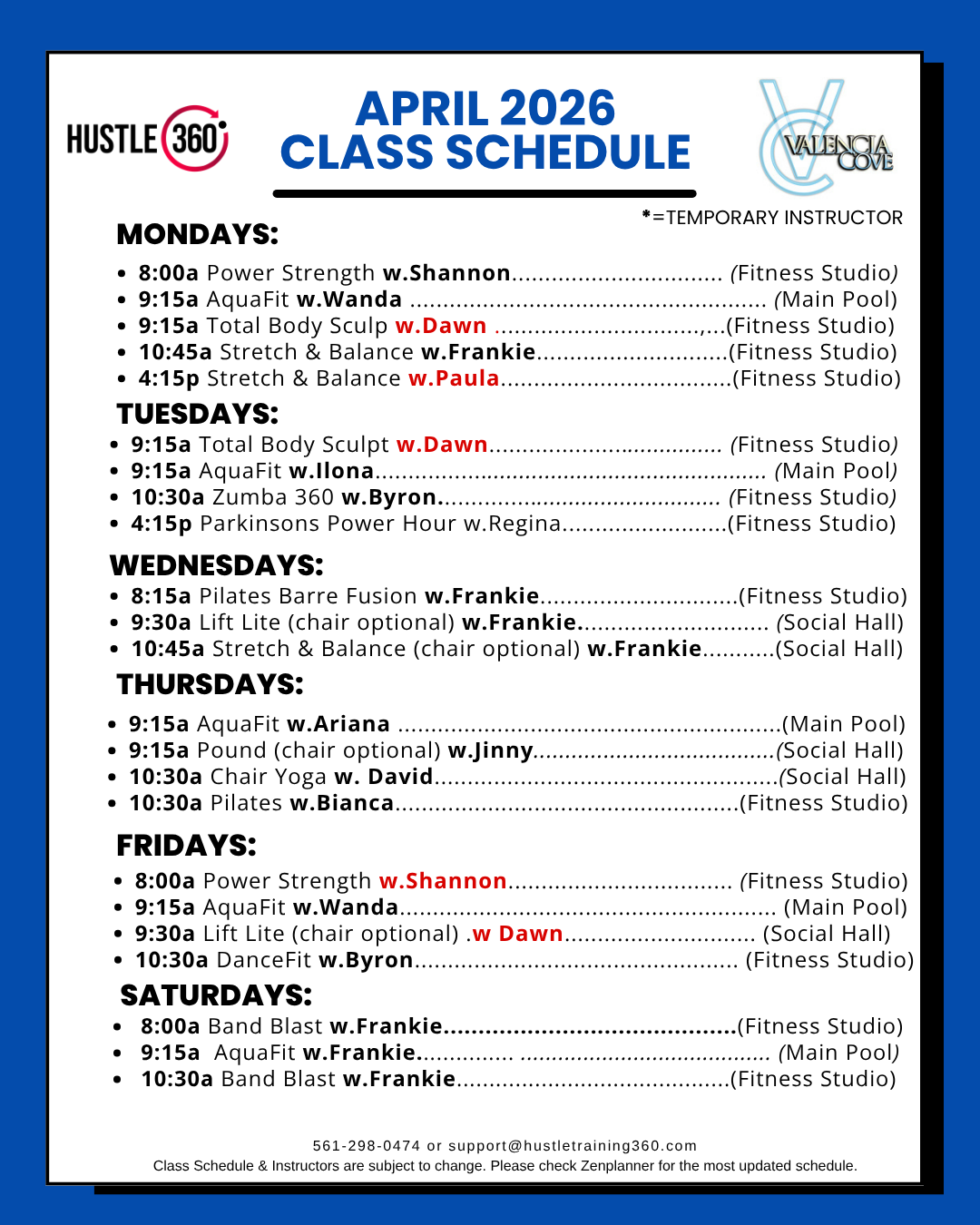 Valencia Cove — Weekly class schedule